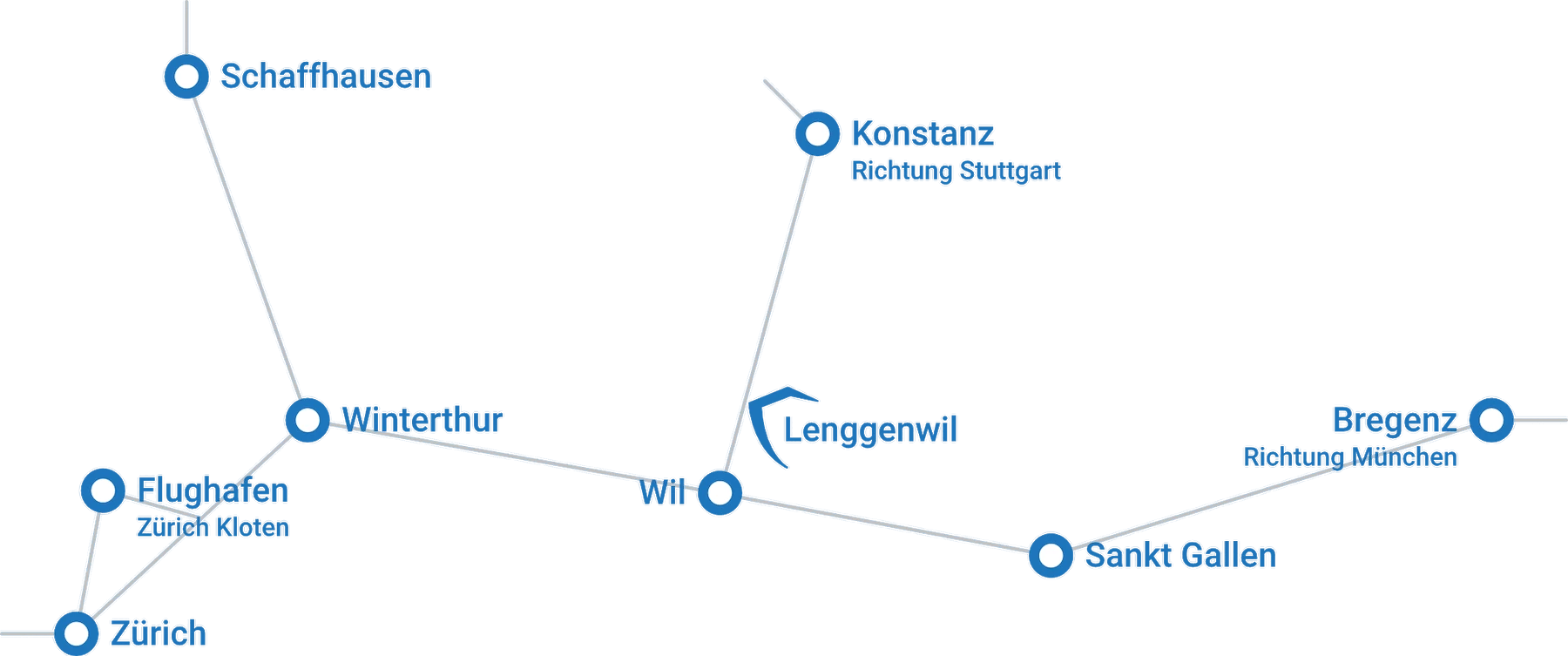 Sie erreichen den Bahnhof Wil (SG) mit dem Zug (auch direkt ab Zürich Flughafen).